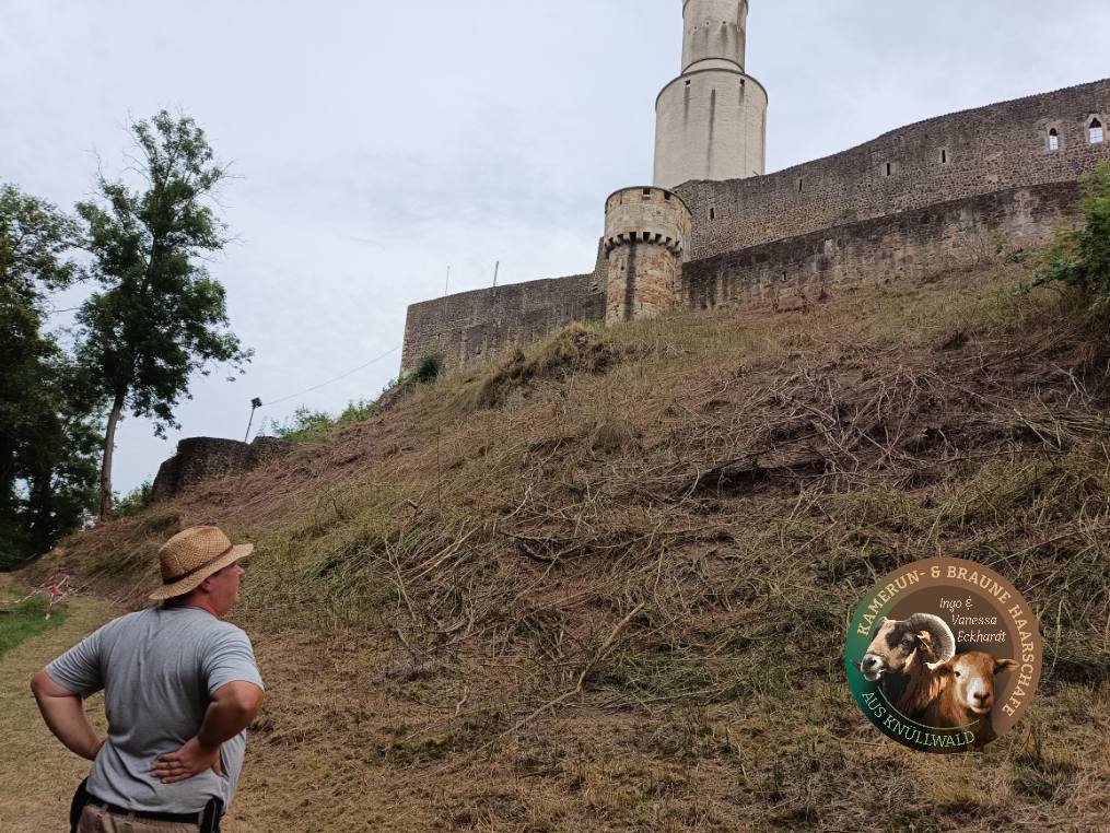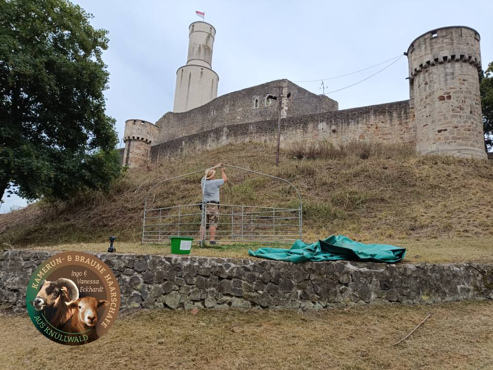 Das Weidezaungerät wurde noch montiert und die Treibzäune aufgebaut. Die Presse war natürlich auch vor Ort. Nun musste alles flott und präzise gehen. Klappe vom Anhänger runter, Schafe und Ziegen raus. Ein paar Posings mit der Tiergruppe vor der Burg für ein Bild und dann hieß es hoch den Berg zum Nordhang.